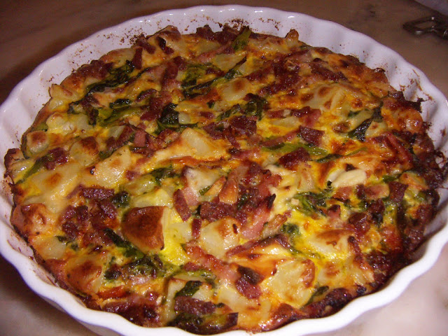 Bati 4 ovos com um dente de alho , uma colher de sopa de farinha com 5 cl de leite .Adicionei chouriço e bacon cortados fininho , as batatas cozidas e cortadas aos cubos e os grelos de nabos aos pedaços com 3 fatias de queijo cortado também aos bocadinhos . Depois de tudo envolvido deitei numa tarteira untada com margarina e foi ao forno a 180º até ficar douradinha .